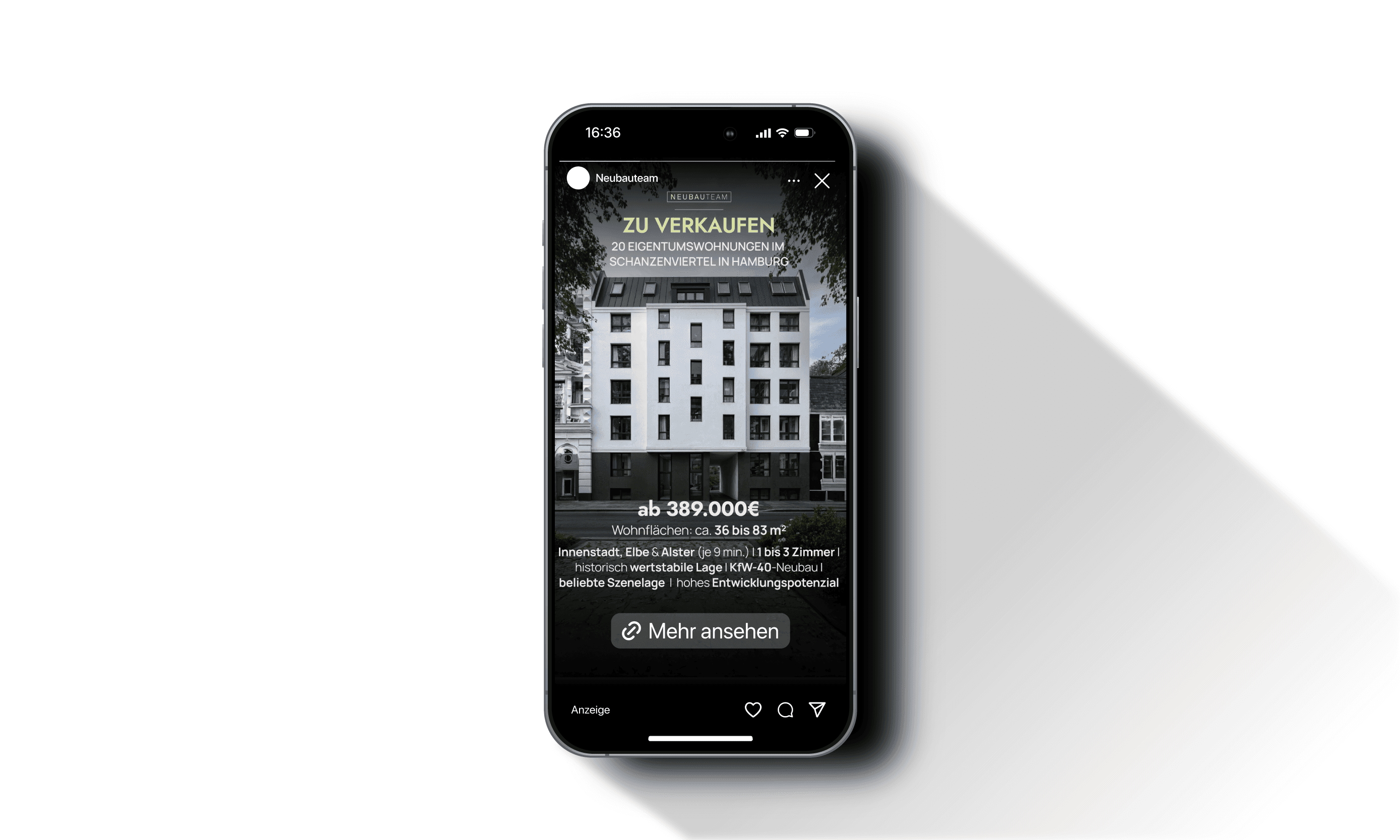 Bei 20 Einheiten gleichzeitig braucht man keinen Tröpfchen-Effekt, sondern eine Welle. Für SCHNZN haben wir das Lebensgefühl der Schanze digitalisiert und direkt in die Feeds der passenden Investoren und Eigennutzer gespielt.